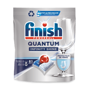 Le produit Finish Quantum Infinity Shine Capsules lave-vaisselle élimine efficacement les résidus alimentaires incrustés et les salissures de graisse, garantit une brillance étincelante et protège le verre de la corrosion grâce à sa technologie spécifique. Les capsules agissent sans aucun effort contre la vaisselle sale avec leur triple action.